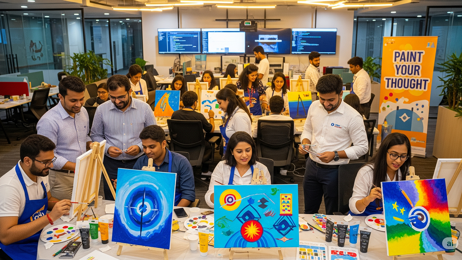 A free-flowing creative corner where employees express emotions through painting—no rules, just colors and calm.